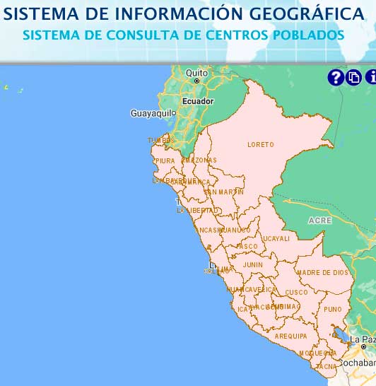El sistema muestra la ubicación del centro poblado, número de habitantes y sus principales características: servicios básicos, vías de transporte y comunicaciones, distancia y tiempo a la capital del distrito, fenómenos naturales y antrópicos a los que está expuesto, entre otros. El Instituto Nacional de Estadística e Informática –INEI, es un organismo técnico especializado, con personería jurídica de derecho público interno, con autonomía técnica y de gestión, dependiente del Presidente del Consejo de Ministros. Es el organismo central y rector del Sistema Estadístico Nacional, responsable de normar, planear, dirigir, coordinar y supervisar las actividades estadísticas oficiales del país.